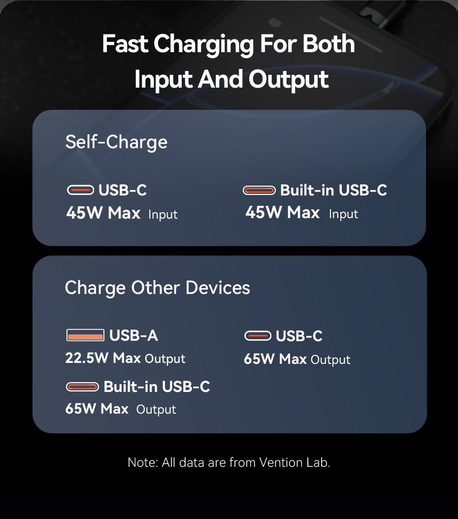 Đầu vào cáp USB-C tích hợp: 5V-3A; 9V-3A; 12V-3A; 15V-3A;